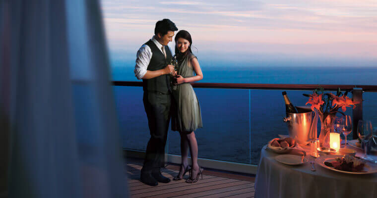 選擇奢華早餐或體驗海上極致浪漫晚餐:豐盛的四道式佳餚,包括多汁的龍蝦尾和鮮嫩牛排、自選飲品、開胃小菜,全部由我們的專屬侍應生在您的私人陽台上提供服務。