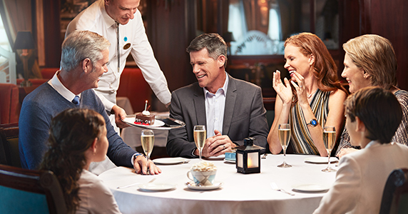 傳統梯次用餐:由我們為您安排固定的用餐時間和席次,有機會結識與您同桌用餐的乘客,並每晚享受由同一個侍應生提供的統一服務。
